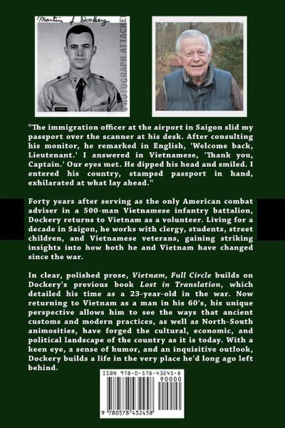 "The immigration officer at the airport in Saigon slid my passport over the scanner at his desk. After consulting his monitor, he remarked in English, 'Welcome back, Lieutenant.' I answered in Vietnamese, 'Thank you, Captain.' Our eyes met. He dipped his head and smiled. I entered his country, stamped passport in hand, exhilarated at what lay ahead." -Vietnam, Full Circle. Forty years after serving as the only American combat adviser in a 500-man Vietnamese infantry battalion, Dockery returns to Vietnam as a volunteer. Living for a decade in Saigon, he works with clergy, students, street children, and Vietnamese veterans, gaining striking insights into how both he and Vietnam have transformed since the war. In clear, polished prose, Vietnam, Full Circle builds on Dockery's previous book Lost in Translation (Random House, 2003), which detailed his time as a 23-year-old in the war. Now returning to Vietnam as a man in his 60's, Dockery's unique perspective allows him to see the ways that ancient customs and modern practices, as well as North-South animosities, have forged the cultural, economic, and political landscape of the country as it is today. With a keen eye, a sense of humor, and an inquisitive outlook, Dockery builds a life in the very place he'd long ago left behind. Appreciating anew the heart and soul of its people, he discovers that it's never too late in life to fall in love.