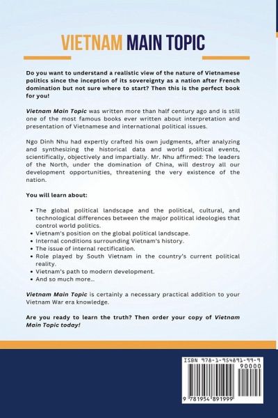 Do you want to understand a realistic view of the nature of Vietnamese politics since the inception of its sovereignty as a nation after French domination but not sure where to start? Then this is the perfect book for you! Vietnam Main Topic was written more than half century ago and is still one of the most famous books ever written about interpretation and presentation of Vietnamese and international political issues. Ngo Dinh Nhu had expertly crafted his own judgments, after analyzing and synthesizing the historical data and world political events, scientifically, objectively and impartially. Mr. Nhu affirmed: The leaders of the North, under the domination of China, will destroy all our development opportunities, threatening the very existence of the nation.You will learn about:The global political landscape and the political, cultural, and technological differences between the major political ideologies that control world politics. Vietnam's position on the global political landscape. Internal conditions surrounding Vietnam's history. The issue of internal rectification. Role played by South Vietnam in the country's current political reality. Vietnam's path to modern development. And so much more... Vietnam Main Topic is certainly a necessary practical addition to your Vietnam War era knowledge. Are you ready to learn the truth? Then order your copy of Vietnam Main Topic today!