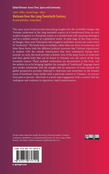 This open access book provides fascinating insights into the incredible changes that Vietnam underwent in the long twentieth century as it transformed from an early modern kingdom to a European colony, to a divided land with opposing ideologies, and to a unified country in a globalized world. At each stage in this long century of changes, there were Vietnamese who sought to mold their society into some vision of "modernity." The book looks at multiple, rather than one form of modernity, and links those forms with the different political moments that Vietnam experienced, in tandem with the outside interlocutors that were maintained during those periods. As such, this book provides a holistic view of the many forms of modernity and their global links that can be found in Vietnam over the course of the long twentieth century. These multiple modernities are documented in this book, and the authors do so by bringing together the strengths of "traditional" language-based area studies scholarship with the insights that an awareness of trans-national and global perspectives provides. Relevant to historians and researchers in the broader arena of Southeast Asian studies with a particular interest in Vietnam-its journey from past to present-this book is a must-read engagement with a country that has undergone and continues to experience, rapid transformation.