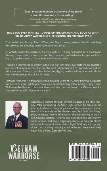 Have you ever wanted to pull up the curtain and look at what the US Army was really like during the Vietnam War? From enlistment through Basic, Officer, and Flight training, veteran pilot Richard Guay will take you on a journey many have never witnessed... Sit with Richard in the cockpit of the venerable UH-1 Huey helicopter as he maneuvers the sky to accomplish missions, protect his troops, and put to the test his years of training to stop the spread of Communism in Southeast Asia. Through a journey from steamy jungles to war-torn skies over battlefields, Richard's raw and informative recollection is a story not only of war, but of brotherhood and the will to survive. Through countless helicopter flights, readers will experience both the fear and the excitement of war firsthand. Vietnam Warhorse is a thrilling memoir detailing years of US Army training, helicopter warfare tactics, and piloting techniques employed during actual enemy engagement. With a touch of humor, this is an intense and fresh perspective on the Vietnam War for anyone interested in history or aviation!