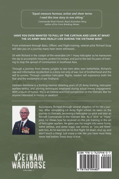 Have you ever wanted to pull up the curtain and look at what the US Army was really like during the Vietnam War? From enlistment through Basic, Officer, and Flight training, veteran pilot Richard Guay will take you on a journey many have never witnessed... Sit with Richard in the cockpit of the venerable UH-1 Huey helicopter as he maneuvers the sky to accomplish missions, protect his troops, and put to the test his years of training to stop the spread of Communism in Southeast Asia. Through a journey from steamy jungles to war-torn skies over battlefields, Richard's raw and informative recollection is a story not only of war, but of brotherhood and the will to survive. Through countless helicopter flights, readers will experience both the fear and the excitement of war firsthand. Vietnam Warhorse is a thrilling memoir detailing years of US Army training, helicopter warfare tactics, and piloting techniques employed during actual enemy engagement. With a touch of humor, this is an intense and fresh perspective on the Vietnam War for anyone interested in history or aviation!