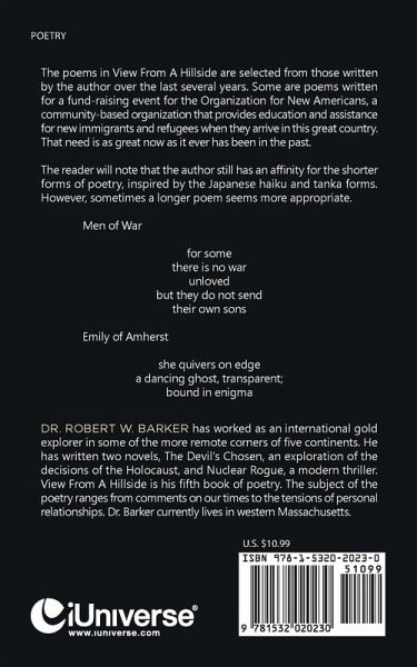 The poems in View From A Hillside are selected from those written by the author over the last several years. Some are poems written for a fund-raising event for the Organization for New Americans, a community-based organization that provides education and assistance for new immigrants and refugees when they arrive in this great country. That need is as great now as it ever has been in the past. The reader will note that the author still has an affinity for the shorter forms of poetry, inspired by the Japanese haiku and tanka forms. However, sometimes a longer poem seems more appropriate. Men of War for some there is no war unloved but they do not send their own sons Emily of Amherst she quivers on edge a dancing ghost, transparent; bound in enigma