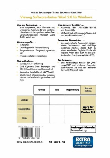 Wie man dieses Buch am besten benutzt.- Symbole, die in diesem Buch benutzt werden.- Schreibweisen und Verfahren.- 1 Einführung in Windows 3.1.- 1 Die Entstehung von Windows.- 2 Funktionsumfang von Windows 3.1.- 3 Windows 3.1 Fenstertechnik und Datenaustausch.- 4 Der Windows 3.1 Datei-Manager.- 5 Schriftarten und Druckersteuerung.- 2 Einführung in Word für Windows 2.0.- 1 Textverarbeitung mit Word für Windows 2.0.- 2 Word für Windows 2.0 installieren und starten.- 3 Grundaufbau von Word für Windows 2.0.- 4 Hilfefunktionen und Lernprogramm.- 3 Grundlegende Word für Windows Techniken.- 1 Grundfunktionen der Dokumenterstellung.- 2 Dokumentbearbeitung.- 3 Zeichen- und Absatzformatierung.- 4 Die Funktionsleiste.- 5 Speichern und Dateiorganisation.- 6 Einführung in Dokumentvorlagen.- 7 Andere Textsysteme in Word für Windows.- 8 Bildschirmansichten in Word für Windows.- 9 Drucken mit Word für Windows.- 4 Weiterverarbeitung von Dokumenten.- 1 Bewegen im Text.- 2 Textbausteine.- 3 Druckformate und Tabulatortechnik.- 4 Anwendung von Dokumentvorlagen.- 5 Numerierung und Aufzählungspunkte.- 6 Rechnen im Text.- 7 Anmerkungen.- 8 Überarbeiten und Versionsvergleich.- 9 Gliederungen.- 10 Felder und Feldfunktionen.- 11 Inhaltsverzeichnisse und Indexierung.- 12 Anpassen der Word für Windows Oberfläche.- 13 Einführung in Makros.- 14 Serienbriefe.- 5 Dokumentgestaltung.- 1 Dokument-Formatierung und Paginierung.- 2 Formatierung von Abschnitten und Spalten.- 3 Kopf- und Fußzeilen.- 4 Fußnoten.- 5 Formatierung von Rahmen und Positionsrahmen.- 6 Grafiken und Tabellen.- 7 OLE und Dynamischer Datenaustausch.- 8 Tabellentechnik in Word für Windows.- 9 Thesaurus.- 10 Silbentrennung.- 11 Rechtschreibkontrolle.- 6 Word für Windows Zusatzprogramme.- 1 Microsoft Draw.- 2 MicrosoftGraph.- 3 Microsoft Formel-Editor.- 4 Microsoft WordArt.- Anhang A Word für Windows 2.0 Tastaturbelegung für IBM AT und Kompatible.- Anhang B Maus-Funktionen.- Der Mauszeiger.- Doppelklick-Tricks bei der Mausanwendung.