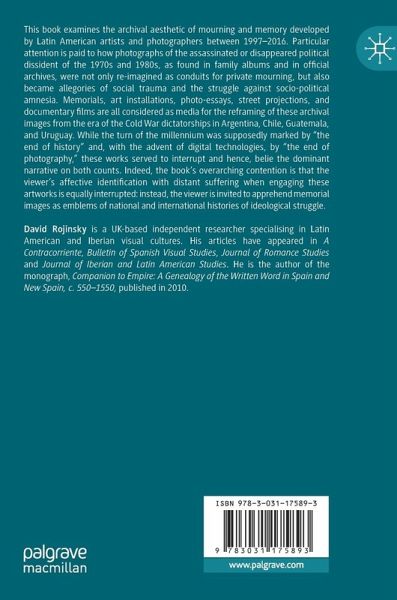 This book examines the archival aesthetic of mourning and memory developed by Latin American artists and photographers between 1997-2016. Particular attention is paid to how photographs of the assassinated or disappeared political dissident of the 1970s and 1980s, as found in family albums and in official archives, were not only re-imagined as conduits for private mourning, but also became allegories of social trauma and the struggle against socio-political amnesia. Memorials, art installations, photo-essays, street projections, and documentary films are all considered as media for the reframing of these archival images from the era of the Cold War dictatorships in Argentina, Chile, Guatemala, and Uruguay. While the turn of the millennium was supposedly marked by "the end of history" and, with the advent of digital technologies, by "the end of photography," these works served to interrupt and hence, belie the dominant narrative on both counts. Indeed, the book's overarching contention is that the viewer's affective identification with distant suffering when engaging these artworks is equally interrupted: instead, the viewer is invited to apprehend memorial images as emblems of national and international histories of ideological struggle.