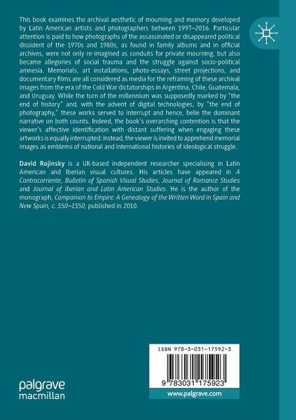 This book examines the archival aesthetic of mourning and memory developed by Latin American artists and photographers between 1997-2016. Particular attention is paid to how photographs of the assassinated or disappeared political dissident of the 1970s and 1980s, as found in family albums and in official archives, were not only re-imagined as conduits for private mourning, but also became allegories of social trauma and the struggle against socio-political amnesia. Memorials, art installations, photo-essays, street projections, and documentary films are all considered as media for the reframing of these archival images from the era of the Cold War dictatorships in Argentina, Chile, Guatemala, and Uruguay. While the turn of the millennium was supposedly marked by "the end of history" and, with the advent of digital technologies, by "the end of photography," these works served to interrupt and hence, belie the dominant narrative on both counts. Indeed, the book's overarching contention is that the viewer's affective identification with distant suffering when engaging these artworks is equally interrupted: instead, the viewer is invited to apprehend memorial images as emblems of national and international histories of ideological struggle.