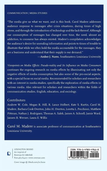 Viewpoints on Media Effects: Pseudo-reality and Its Influence on Media Consumers continues the ongoing research of media effects by illuminating not only the negative effects of media consumption, but also some of the pro-social aspects, with a special focus on social media. Recommended for scholars and researchers with an interest in media studies, specifically the exploration of media effects in various media. Also relevant scholars and researchers within the fields of communication studies, English, education, and sociology.