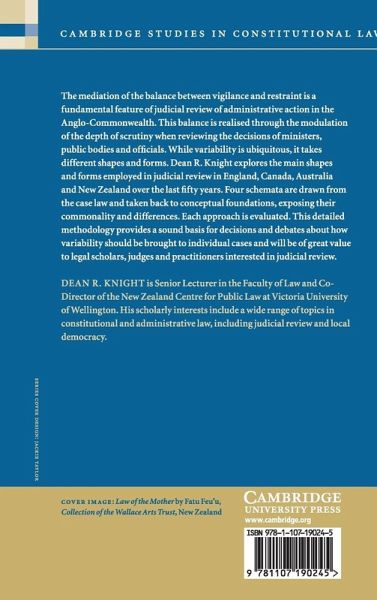 The mediation of the balance between vigilance and restraint is a fundamental feature of judicial review of administrative action in the Anglo-Commonwealth. This balance is realised through the modulation of the depth of scrutiny when reviewing the decisions of ministers, public bodies and officials. While variability is ubiquitous, it takes different shapes and forms. Dean R. Knight explores the main shapes and forms employed in judicial review in England, Canada, Australia and New Zealand over the last fifty years. Four schemata are drawn from the case law and taken back to conceptual foundations, exposing their commonality and differences, and each approach is evaluated. This detailed methodology provides a sound basis for decisions and debates about how variability should be brought to individual cases and will be of great value to legal scholars, judges and practitioners interested in judicial review.