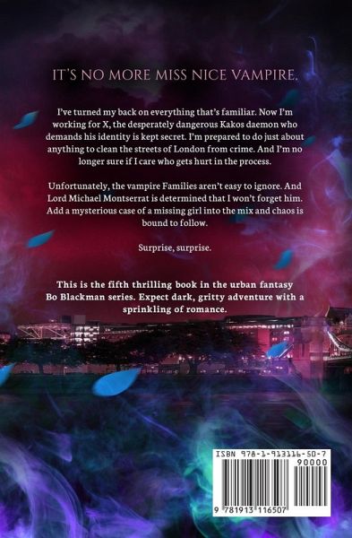 It's no more Miss Nice Vampire. I've turned my back on everything that's familiar. Now I'm working for X, the desperately dangerous Kakos daemon who demands his identity is kept secret. I'm prepared to do just about anything to clean the streets of London from crime. And I'm no longer sure if I care who gets hurt in the process. Unfortunately, the vampire Families aren't easy to ignore. And Lord Michael Montserrat is determined that I won't forget him. Add a mysterious case of a missing girl into the mix and chaos is bound to follow. Surprise, surprise. This is the fifth thrilling book in the urban fantasy Bo Blackman series. Expect dark, gritty adventure with a sprinkling of romance. Book One - Dire Straits Book Two - New Order Book Three - High Stakes Book Four - Red Angel Book Five - Vigilante Vampire Book Six - Dark Tomorrow