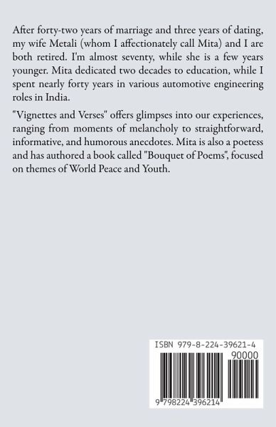 After forty-two years of marriage and three years of dating, my wife Metali (whom I affectionately call Mita) and I are both retired. I'm almost seventy, while she is a few years younger. Mita dedicated two decades to education, while I spent nearly forty years in various automotive engineering roles in India. "Vignettes and Verses" offers glimpses into our experiences, ranging from moments of melancholy to straightforward, informative, and humorous anecdotes. Mita is also a poetess and has authored a book called "Bouquet of Poems", focused on themes of World Peace and Youth.