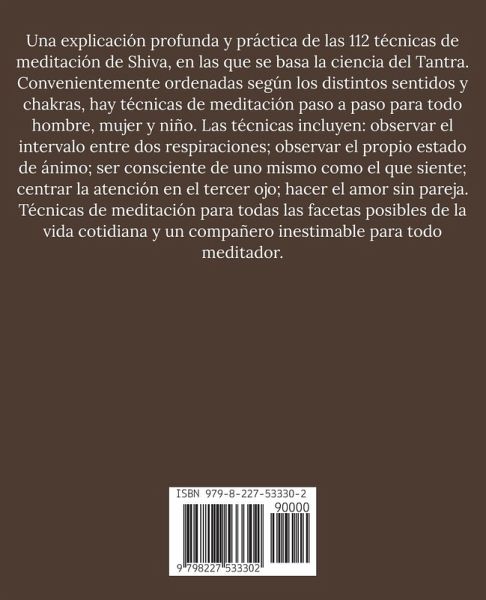Una explicación profunda y práctica de las 112 técnicas de meditación de Shiva, en las que se basa la ciencia del Tantra. Convenientemente ordenadas según los distintos sentidos y chakras, hay técnicas de meditación paso a paso para todo hombre, mujer y niño. Las técnicas incluyen: observar el intervalo entre dos respiraciones; observar el propio estado de ánimo; ser consciente de uno mismo como el que siente; centrar la atención en el tercer ojo; hacer el amor sin pareja. Técnicas de meditación para todas las facetas posibles de la vida cotidiana y un compañero inestimable para todo meditador.