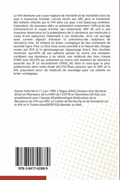 Le VIH demeure une cause majeure de mortalité et de morbidité dans les pays à ressources limitées. L'accès récent aux ARV pour le traitement des enfants infectés par le VIH dans ces pays s'est beaucoup amélioré. Cependant, de nouveaux défis se présentent notamment l'efficacité des traitements et le risque d'échec aux traitements ARV dû soit à une mauvaise observance ou la préexistence de la résistance aux molécules à cause d'une exposition maternelle à ces molécules. Ainsi cet ouvrage avait comme objectif d'évaluer la prévalence des mutations de résistance chez 24 enfants en échec virologique de leur traitement de seconde ligne. Pour ce faire nous avons procédé à la mesure des charges virales par PCR et le génotypage par séquençage direct. Nos résultats montrent que 83% de nos patients portait au moins une mutation conférant une résistance à au moins une molécule des trois classes d'ARV avec 58,33% qui présentait au moins une mutation de résistance associée aux IP. Le recombinant CRF02_AG était le sous-type le plus prédominant dans notre étude (62,5%) Nous pensons que le DRV et le RAL pourraient servir de molécule de sauvetage pour ces enfants en échec virologique.