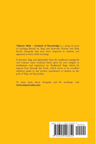 Vijnana Mala - Garland of Knowledge is a string of sutras or teaching threads by Yoga and Ayurveda Teacher and Veda Kovid, Durgadas that have been imparted to students and appeared in many of his teachings. It discusses Yoga and Spirituality from the traditional standpoint and contains many wisdoms based upon his own insights in meditations and experience in Traditional Yoga which he imparts here through this book, which serves as an excellent reference guide to any teacher, practitioner or student on the path of Yoga and Spirituality.