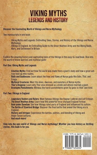 Discover the Fascinating World of Vikings and Norse Mythology Two manuscripts in one book: Viking Myths and Legends: Enthralling Tales, Stories, and History of the Vikings and Norse Mythology Vikings in England: An Enthralling Guide to the Great Heathen Army and the Viking Raids, Wars, and Settlement in Britain Explore the amazing history and captivating tales of the Vikings in this easy-to-read book. Dive into the world of brave warriors and mythical gods! Part One: Viking Myths and Legends Creation Myths: Find out how the world was made from a giant's body and how a great ash tree held up nine realms. Gods and Goddesses: Learn about the lives and flaws of Norse gods like Odin, Thor, and Freyja. Mythical Creatures: Meet the elves, dwarves, and monsters of Norse myths. Medieval Manipulations: Discover how Christian scholars changed ancient stories. Thor's Disguise: Learn why Thor once dressed as a bride and almost married a giant. The Norns' Weaving: See how these beings controlled the fate of gods and humans. Mjölnir's Creation: Read about the making of Thor's powerful hammer. Mistletoe's Role: Understand how mistletoe led to the end of the world. Gruesome Punishments: Witness the harsh punishments given by gods to their own kind. Part Two: Vikings in England Legendary Raiders and Rulers: Meet famous Vikings like Ragnar Lodbrok and Leif Erikson. The Great Heathen Army: Learn how this powerful force changed England forever. Rule under Danelaw: See how Vikings ruled parts of England and influenced its culture. The Battle of Stamford Bridge: Discover the final battle that ended the Viking era in England. History and Intrigue: Experience the battles, politics, and blending of Viking and Anglo-Saxon cultures. And much more! Step into the epic world of Vikings and Norse mythology!