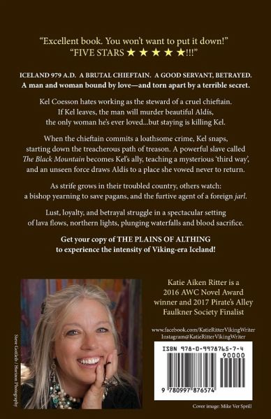 Book I, Norse Adventure series: ICELAND, 979 A.D. A GOOD MAN, BETRAYED. A WOMAN, THREATENED. Two people bound by brave ideals-and torn apart by a terrible secret. A corrupt chieftain plots to rule of all Iceland, and his steward Kel Coesson may be the only man who can stop him. But there's a catch: if Kel dares to defy his leader, Kel's love Aldís will be killed. A fearless slave called 'The Black Mountain' starts Kel down the treacherous path of treason-and when the chieftain commits a loathsome crime, Kel snaps. An unseen force draws Aldís to a place she vowed never to return, forcing her to confront her past-and a long-buried secret threatens her future. As strife grows, others meddle: a bishop eager to convert pagans, and a foreign jarl's furtive agent with her own designs on the country's young democracy. Set in the dramatic landscape of Viking-era Iceland, a rich cast of characters battle corruption, lust, and loyalty in a spectacular setting of lava flows, northern lights, plunging waterfalls and blood sacrifice. This first novel sets up the prelude to an Icelandic family saga: five books spanning two generations and two continents explore themes such as the hero's journey, loyalty under duress, accurate everyday life in medieval Scandinavia, slavery in European societies, the rule of law against corruption and creeping authoritarianism, the world's first democracy at Althing, pagan beliefs and conversion to Christianity, with strong female, Norse, enslaved and black protagonists-all amid Iceland's dramatic landscape in the land of fire and ice. Readers who enjoyed Jean Auel's Clan of the Cave Bear, Ken Follett's The Pillars of the Earth, or the History Channel's Vikings may appreciate this well-researched and historically-relevant novel. Get your copy of THE PLAINS OF ALTHING to experience the intensity of Viking-era Iceland! Katie Aiken Ritter is a 2016 AWC Novel Award winner and 2017 Pirate's Alley Faulkner Society finalist. "Great summer reading and thrilling escapist fiction in a deeply-researched historical novel. Highly recommended." "Excellent book. You won't want to put it down!" "FIVE STARS ¿ ¿ ¿ ¿ ¿!!!" VIKING: The Plains of Althing is Book 1 of the Norse Adventure series
