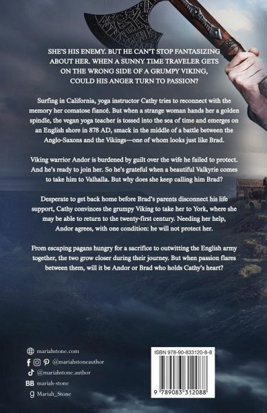 She's his enemy. But he can't stop fantasizing about her. When a sunny time traveler gets on the wrong side of a grumpy Viking, could his anger turn to passion? Surfing in California, yoga instructor Cathy tries to reconnect with the memory her comatose fiancé. But when a strange woman hands her a golden spindle, the vegan yoga teacher is tossed into the sea of time and emerges on an English shore in 878 AD, smack in the middle of a battle between the Anglo-Saxons and the Vikings-one of whom looks just like Brad. Viking warrior Andor is burdened by guilt over the wife he failed to protect. And he's ready to join her. So he's grateful when a beautiful Valkyrie comes to take him to Valhalla. But why does she keep calling him Brad? Desperate to get back home before Brad's parents disconnect his life support, Cathy convinces the grumpy Viking to take her to York, where she may be able to return to the twenty-first century. Needing her help, Andor agrees, with one condition: he will not protect her. From escaping pagans hungry for a sacrifice to outwitting the English army together, the two grow closer during their journey. But when passion flares between them, will it be Andor or Brad who holds Cathy's heart?