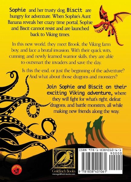 Sophie and her trusty dog, Biscit are hungry for adventure. When Sophie's Aunt Banana reveals her crazy time portal, Sophie and Biscit cannot resist and are launched back to Viking times. In this new world, they meet Brook, the Viking farm boy, and fight off a brutal invasion. With their quick wits, cunning, and newly learned warrior skills, they are able to outsmart the invaders and save the day. Is this the end, or just the beginning of the adventure? And what about those dragons and monsters? Join Sophie and Biscit on their exciting Viking adventure, where they will fight for what's right, defeat dragons, and battle monsters, all while making new friends along the way.