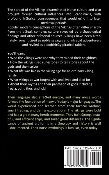 The spread of the Vikings disseminated Norse culture and also brought foreign cultural influences into Scandinavia, with profound historical consequences that would echo into later medieval periods. Popular modern conceptions of the Vikings often differ sharply from the actual, complex culture revealed by archaeological findings and other historical sources. Vikings have been alternately romanticized as noble savages and intrepid adventurers and reviled as bloodthirsty piratical raiders. You'll learn:Who the vikings were and why they raided their neighbors How the vikings used runestones to tell stories about the gods and themselves What life was like in the viking age for an ordinary viking family What vikings at war fought with and lived and died for About their myths and their pantheon of gods including freyja, odin, thor, and loki Their language also affected europe, and many norse words formed the foundation of many of today's major languages. The world experienced and learned from their tactical warfare, smart trading, and daring explorations. The vikings were bold and had a great many heroic moments. They built strong, beautiful, and efficient ships, and sailed great distances. The significance of ancient art forms in archeology and history is well documented. Their norse mythology is familiar, even today.
