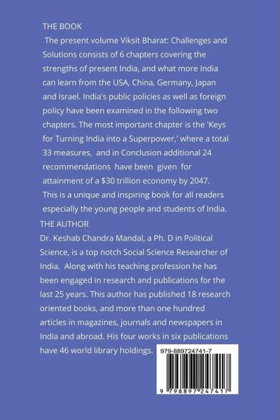 This present volume Viksit Bharat: Challenges and Solutions is a unique book on the Indian economy and human development. The book consists of six chapters, and each is a treasure trove. In the first chapter, the author has examined India's strengths including its agriculture, defense, economy, gender empowerment, trade & commerce, industries & infrastructure, fintech, digitization, health system, science & technology, space mission, etc. The second chapter traces the best technology, knowledge, and policies adopted by some industrially developed countries such as the USA, China, Germany, Japan, and Israel. Here, the author shows how the students, youths, and policymakers can benefit from the lessons of these countries. The third chapter of the book enumerates the existing public policies that are instrumental in transforming the socio-economic condition of people. The fourth chapter examines India's foreign policy right from the first prime minister Jawaharlal Nehru to Narendra Modi. Chapter five - Keys for Turning India into a Superpower - is the most important chapter, where the author provides a total of 34 keys for turning India into a Viksit Bharat. The concluding chapter highlights some major challenges prevailing in contemporary India and thereafter provides 24 scientific prescriptions for the socio-economic growth of people, and human development in India by 2047.