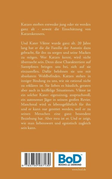 Katzen sterben entweder jung oder sie werden ganz alt - soweit die Einschätzung von Katzenkennern. Und Kater Viktor wurde ganz alt. 20 Jahre lang hat er die die Familie der Autorin dazu gebracht, für ihn zu sorgen und seine Macken zu mögen. Wer Katzen kennt, wird nicht überrascht sein. Denn diese Charaktertiere auf Samtpfoten bringen uns bei, sich auf sie einzustellen. Dafür belohnen sie uns mit absolutem Wohlbefinden. Katzen stehen in inniger Bindung zu uns, wie sie rational nicht zu erklären ist. Sie lieben es häuslich, geraten aber auch in kniffelige Situationen. Viktor ist ein solcher Kater: eigensinnig, anspruchsvoll, ein autonomer Jäger in seinem großen Revier. Manchmal wird es lebensgefährlich für ihn und er kann nur gerettet werden, weil er zu seinen Menschen eine ganz besondere Beziehung hat. Aber treu ist er. Und er zeigt, wie man liebenswert und egoistisch zugleich sein kann.