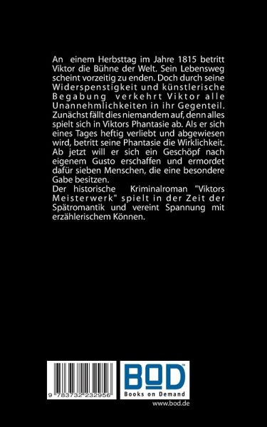 An einem Herbsttag im Jahre 1815 betritt Viktor die Bühne der Welt. Sein Lebensweg scheint vorzeitig zu enden. Doch durch seine Widerspenstigkeit und künstlerische Begabung verkehrt Viktor alle Unannehmlichkeiten in ihr Gegenteil. Zunächst fällt dies niemandem auf, denn alles spielt sich in Viktors Phantasie ab. Als er sich eines Tages heftig verliebt und abgewiesen wird, betritt seine Phantasie die Wirklichkeit. Ab jetzt will er sich ein Geschöpf nach eigenem Gusto erschaffen und ermordet dafür sieben Menschen, die eine besondere Gabe besitzen.Der historische Kriminalroman "Viktors Meisterwerk" spielt in der Zeit der Spätromantik und vereint Spannung mit erzählerischem Können.