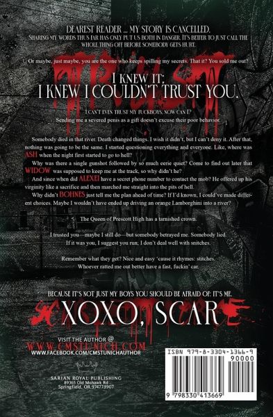 Dearest Reader ... my story is cancelled. Sharing my words thus far has only put us both in danger. It's better to just call the whole thing off before somebody gets hurt. Or maybe, just maybe, you are the one who keeps spilling my secrets. That it? You sold me out? I knew it; I knew I couldn't trust you. I can't even trust my fuckboys, now can I? Sending me a severed penis as a gift doesn't excuse their poor behavior. Somebody died in that river. Death changed things. I wish it didn't, but I can't deny it. After that, nothing was going to be the same. I started questioning everything and everyone. Like, where was Ash when the night first started to go to hell? Why was there a single gunshot followed by so much eerie quiet? Come to find out later that Widow was supposed to keep me at the track, so why didn't he? And since when did Alexei have a secret phone number to contact the mob? He offered up his virginity like a sacrifice and then marched me straight into the pits of hell. Why didn't Bohnes just tell me the plan ahead of time? If I'd known, I could've made different choices. Maybe I wouldn't have ended up driving an orange Lamborghini into a river? The Queen of Prescott High has a tarnished crown. I trusted you-maybe I still do-but somebody betrayed me. Somebody lied.If it was you, I suggest you run; I don't deal well with snitches. Remember what they get? Nice and easy 'cause it rhymes: stitches.Whoever ratted me out better have a fast, fuckin' car. Because it's not just my boys you should be afraid of: it's me. XOXO, Scar