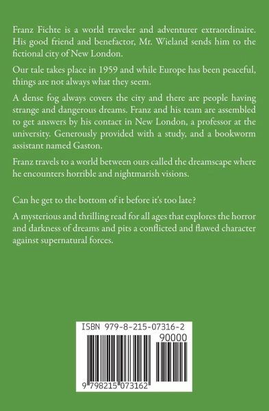 Franz Fichte is a world traveler and adventurer extraordinaire. His good friend and benefactor, Mr. Wieland sends him to the fictional city of New London. Our tale takes place in 1959 and while Europe has been peaceful, things are not always what they seem. A dense fog always covers the city and there are people having strange and dangerous dreams. Franz and his team are assembled to get answers by his contact in New London, a professor at the university. Generously provided with a study, and a bookworm assistant named Gaston. Franz travels to a world between ours called the dreamscape where he encounters horrible and nightmarish visions. Can he get to the bottom of it before it's too late? A mysterious and thrilling read for all ages that explores the horror and darkness of dreams and pits a conflicted and flawed character against supernatural forces.