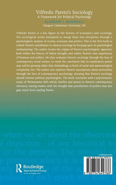 Vilfredo Pareto is a key figure in the history of economics and sociology. His sociological works attempted to merge these two disciplines through a psychologistic analysis of society, economy and politics. This is the first book to rethink Pareto's contribution to classical sociology by focusing upon its psychological underpinning. The author locates the origins of Pareto's psychologistic approach both within the history of Italian thought and within Pareto's own experiences of business and politics. He evaluates Pareto's sociology through the lens of contemporary social science, examining whether its explanatory power is growing rather than diminishing as levels of social and epistemological complexity rise. The volume also explores Pareto's assumptions about personality through the lens of contemporary psychology. It concludes with a psychometric study of Westminster MPs which clarifies and attests to Pareto's contemporary relevance, and indicates that even practitioners of politics may gain much from reading Pareto.