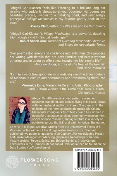 Abigail Carl-Klassen is a poet, writer, researcher, educator, translator, and activist living in El Paso, Texas, with her husband and two children. She grew up in the oil fields of the Permian Basin alongside Old Colony Mennonite immigrants from Mexico and has worked in education, language services, community development, social science research, and agriculture in a variety of contexts across the U.S. and Latin America. She earned an MFA in Bilingual Creative Writing from the University of Texas at El Paso and her work has been published widely in English and Spanish, appearing in ZYZZYVA, Catapult, Cimarron Review, Guernica, Aster(ix) Huizache, and others. She has published two poetry chapbooks, A'int Country Like You (Digging Press) and Shelter Management (dancing girl press). Recordings of her oral history project, "Rebels, Exiles, and Bridge Builders: Cross-Cultural Encounters in the Campos Menonitas of Chihuahua" can be found on the Darp Stories YouTube channel.