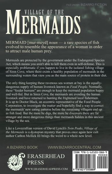 MERMAID [mur-meyd] noun -- a rare species of fish evolved to resemble the appearance of a woman in order to attract male human prey. Mermaids are protected by the government under the Endangered Species Act, which means you aren't able to kill them even in self-defense. This is especially problematic if you happen to live in the isolated fishing village of Siren Cove, where there exists a healthy population of mermaids in the surrounding waters that view you as the main source of protein in their diet. The only thing standing between you and the ravenous sea women is the equally-dangerous supply of human livestock known as Food People. Normally, these "feeder humans" are enough to keep the mermaid population happy and well-fed. But in Siren Cove, the mermaids are avoiding the human livestock and have returned to hunting the frightened local fishermen. It is up to Doctor Black, an eccentric representative of the Food People Corporation, to investigate the matter and hopefully find a way to correct the mermaids' new eating patterns before the remaining villagers end up as fish food. Like a Lovecraftian version of David Lynch's Twin Peaks, Village of the Mermaids is a dystopian mystery for the bizarro fiction fan. It proves, once again, how cult author Carlton Mellick III brings the weird to a whole new level.