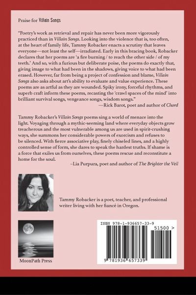 "Poetry's work as retrieval and repair has never been more vigorously practiced than in Villain Songs. Looking into the violence that is, too often, at the heart of family life, Tammy Robacker enacts a scrutiny that leaves everyone-not least the self-irradiated. Early in this bracing book, Robacker declares that her poems are 'a fire burning / to reach the other side / of my teeth.' And so, with a furious but deliberate poise, the poems do exactly that, giving image to what had been in the shadows, giving voice to what had been erased. However, far from being a project of confession and blame, Villain Songs also asks about art's ability to evaluate and value experience. These poems are as artful as they are wounded. Spiky irony, forceful rhythms, and superb craft inform these poems, recasting the 'crawl spaces of the mind' into brilliant survival songs, vengeance songs, wisdom songs." -Rick Barot, poet and author of Chord ***** Tammy Robacker's Villain Songs poems sing a world of menace into the light. Voyaging through a mythic-seeming land where everyday objects grow treacherous and the most vulnerable among us are used in spirit-crushing ways, she summons her considerable powers of exorcism and refuses to be silenced. With fierce associative play, finely chiseled lines, and a highly controlled sense of form, she dares to speak the hardest truths. If shame is a force that exiles us from ourselves, these poems rescue and reconstitute a home for the soul. -Lia Purpura, poet and author of The Brighter the Veil