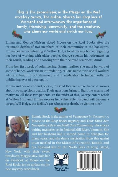 This is the second book in the Moose on the Roof mystery series. The author shares her deep love of Vermont and interweaves the importance of family, friendship, community, and the creatures who share our world and enrich our lives. Emma and George Nielsen closed Moose on the Roof Books after the traumatic deaths of two members of their community at the bookstore. Emma begins volunteering at Willow Hill, a local nursing home, reigniting her love of working with older people. George spends his retirement on their couch, reading and snoozing with their beloved senior cat, Annie. From her first week of volunteering, Emma realizes she must be wary of some of her co-workers: an intimidating, callous nurse, twin social workers who are beautiful but damaged, and a medication technician with the unblinking eyes of a sociopath. Emma and her new friend, Vickie, the kind Hospice nurse, become curious about two suspicious deaths. Their questions bring to light the means and motive to kill these two patients. In the midst of this, George enters rehab at Willow Hill, and Emma worries her vulnerable husband will become a target. Will Helga, the facility's cat who senses death, be visiting him?