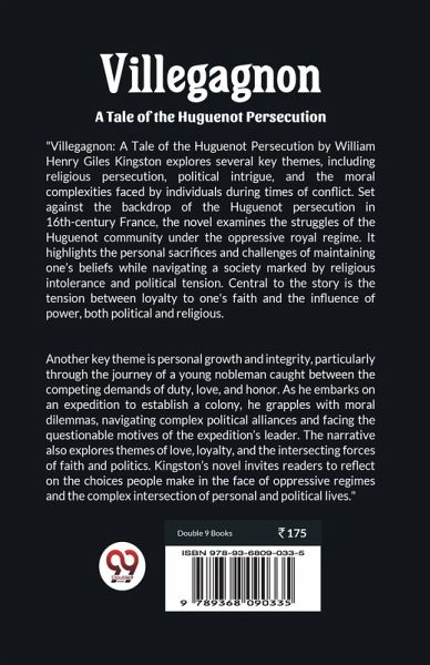 Villegagnon: A Tale of the Huguenot Persecution by William Henry Giles Kingston explores several key themes, including religious persecution, political intrigue, and the moral complexities faced by individuals during times of conflict. Set against the backdrop of the Huguenot persecution in 16th-century France, the novel examines the struggles of the Huguenot community under the oppressive royal regime. It highlights the personal sacrifices and challenges of maintaining one's beliefs while navigating a society marked by religious intolerance and political tension. Central to the story is the tension between loyalty to one's faith and the influence of power, both political and religious. Another key theme is personal growth and integrity, particularly through the journey of a young nobleman caught between the competing demands of duty, love, and honor. As he embarks on an expedition to establish a colony, he grapples with moral dilemmas, navigating complex political alliances and facing the questionable motives of the expedition's leader. The narrative also explores themes of love, loyalty, and the intersecting forces of faith and politics. Kingston's novel invites readers to reflect on the choices people make in the face of oppressive regimes and the complex intersection of personal and political lives.