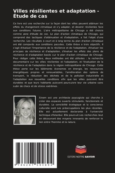 Ce livre est une recherche sur la façon dont les villes peuvent atténuer les effets du changement climatique et s'y adapter, et devenir résilientes face aux conditions futures. L'aire métropolitaine de Chicago a été choisie comme zone d'étude de cas. Le plan d'action climatique de Chicago, qui comprend des tactiques d'atténuation et d'adaptation, a fait l'objet d'une recherche. Les résultats à court et à long terme du plan d'action climatique ont été comparés aux conditions passées. Cette thèse a trois objectifs. Il s'agit d'évaluer l'importance de la résilience et de l'adaptation, d'évaluer les principes de résilience et d'adaptation, d'évaluer les effets des plans de résilience et d'adaptation basés sur le plan d'action climatique de Chicago. Pour rédiger cette thèse, deux méthodes ont été utilisées : la recherche documentaire sur les villes résilientes et l'adaptation, et l'évaluation de la résilience et de l'adaptation dans la région métropolitaine de Chicago. Cette thèse porte sur les bâtiments économes en énergie, les ressources énergétiques propres et renouvelables, l'amélioration des options de transport, la réduction des déchets et de la pollution industrielle et l'adaptation aux nouvelles conditions afin que les villes puissent être durables et que leurs habitants puissent poursuivre leur vie urbaine sans subir de chocs et de stress extrêmes.