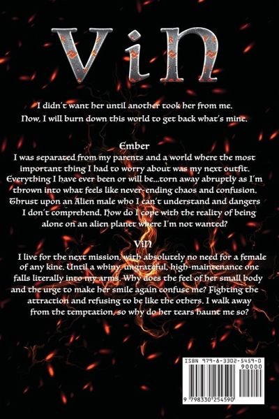 Ember I was separated from my parents and a world where the most important thing I had to worry about was my next outfit. Everything I have ever been or will be... torn away abruptly as I'm thrown into what feels like never-ending chaos and confusion. Thrust upon an Alien male who I can't understand and dangers I don't comprehend. How do I cope with the reality of being alone on an alien planet where I'm not wanted? ViN I live for the next mission, with absolutely no need for a female of any kind. Until a whiny, ungrateful, high-maintenance one falls literally into my arms. Why does the feel of her small body and the urge to make her smile again confuse me? Fighting the attraction and refusing to be like the others. I walk away from the temptation, so why do her tears haunt me so?