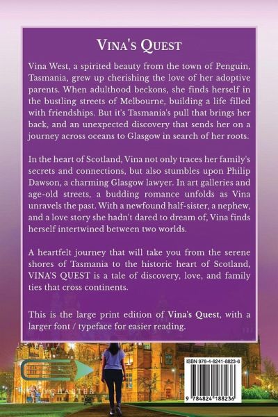 Vina West, a spirited beauty from the town of Penguin, Tasmania, grew up cherishing the love of her adoptive parents. When adulthood beckons, she finds herself in the bustling streets of Melbourne, building a life filled with friendships. But it's Tasmania's pull that brings her back, and an unexpected discovery that sends her on a journey across oceans to Glasgow in search of her roots. In the heart of Scotland, Vina not only traces her family's secrets and connections, but also stumbles upon Philip Dawson, a charming Glasgow lawyer. In art galleries and age-old streets, a budding romance unfolds as Vina unravels the past. With a newfound half-sister, a nephew, and a love story she hadn't dared to dream of, Vina finds herself intertwined between two worlds. A heartfelt journey that will take you from the serene shores of Tasmania to the historic heart of Scotland, VINA'S QUEST is a tale of discovery, love, and family ties that cross continents. This is the large print edition of Vina's Quest, with a larger font / typeface for easier reading.