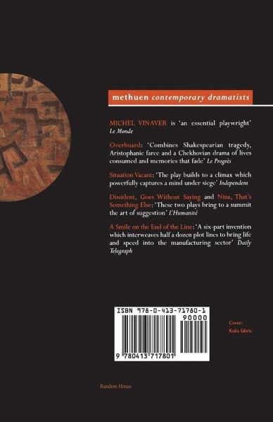The first collection of plays by one of France's most prominent playwrights Overboard: "Combines Shakespearian tragedy, Aristophanic farce and a Chekhovian drama of lives consumed and memories that fade." Le Progrès, Situation Vacant: "The play builds to a climax which powerfully captures a mind under siege, bombarded by a cacophony of voices and tormented by guilt." (Independent); Dissident, Goes Without Saying and Nina, That's Something Else: "These two plays bring to a summit the art of suggestions...Two fables in which prosaic everyday life is captured, at times fraught with pathos, often compassionate." (L'Humanité ); A Smile on the End of the Line: "A six-part invention which interweaves half a dozen plot lines to bring life and speed into the manufacturing sector." (Daily Telegraph)