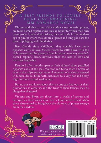 Vincent & Sivan is an explicit, best-friends-to-lovers, dual gay awakening, adult MM romance novel. Vincent and Sivan, sons of the world's most powerful pirates, are to be named captains this year, an honor for when they turn twenty-one. Under their fathers, they will rule in the modern age of pirates where the seas are at peace and long gone are the days of pillaging and plundering. Best friends since childhood, they couldn't have more opposite views on love. Vincent wants to settle down with the right person, despite pressure from his father to marry once he's named captain. Sivan, however, finds the idea of love and marriage laughable. Reunited after months apart as their fathers' ships patrolled opposite ends of the seas, Vincent and Sivan share a bottle of rum in the ship's storage room. A moment of curiosity steeped in hidden desire, filthy with lust, leads to a very hot and heavy night of rum-soaked awakenings... But no one can know about this, no one can find out, or their promotions as captains, and the trust of their fathers, may be altogether shattered. Vincent and Sivan are thrust into a world of secrets and betrayal, as their crews now face a long-buried threat when those determined to bring back the old ways of pirates emerge from the shadows.