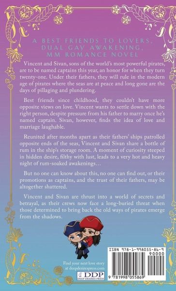 Vincent & Sivan is an explicit, best-friends-to-lovers, dual gay awakening, adult MM romance novel. Vincent and Sivan, sons of the world's most powerful pirates, are to be named captains this year, an honor for when they turn twenty-one. Under their fathers, they will rule in the modern age of pirates where the seas are at peace and long gone are the days of pillaging and plundering. Best friends since childhood, they couldn't have more opposite views on love. Vincent wants to settle down with the right person, despite pressure from his father to marry once he's named captain. Sivan, however, finds the idea of love and marriage laughable. Reunited after months apart as their fathers' ships patrolled opposite ends of the seas, Vincent and Sivan share a bottle of rum in the ship's storage room. A moment of curiosity steeped in hidden desire, filthy with lust, leads to a very hot and heavy night of rum-soaked awakenings... But no one can know about this, no one can find out, or their promotions as captains, and the trust of their fathers, may be altogether shattered. Vincent and Sivan are thrust into a world of secrets and betrayal, as their crews now face a long-buried threat when those determined to bring back the old ways of pirates emerge from the shadows.