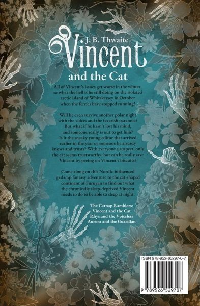 On the Arctic island of Whitskersey, the harsh winter cold and seemingly endless polar night wreak havoc on Vincent's health. With no more ferries running for the year, there's no escaping the eerie voices and feverish paranoia. As things take a turn from bad to worse, is Vincent just delusional, or is there really someone out to get him? Can his trusty feline companion save the day by peeing on his biscuits? Venture to the cat-shaped continent of Furuyan in this Nordic-infused gaslamp fantasy adventure to find out what Vincent needs to do to sleep at night. This creepy cosy first installment of The Catnap Ramblers trilogy is described as similar in style to Terry Pratchett's novels. It has been recommended to readers who've enjoyed Morgan Stang's The Bookshop and the Barbarian, Rebecca Thorne's Can't Spell Treason without Tea, and Delemhach's The House Witch.