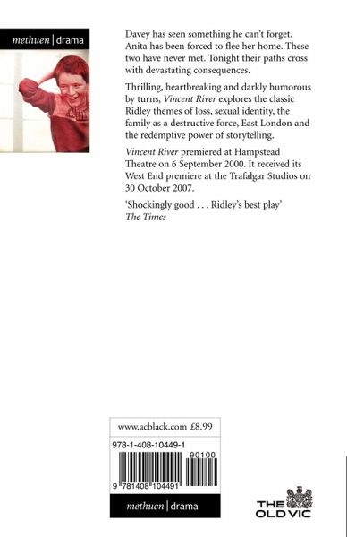 Davey has seen something he can't forget. Anita has been forced to flee her home. These two have never met. Tonight their paths cross with devastating consequences. Thrilling, heartbreaking and darkly humorous by turns, Vincent River explores the classic Ridley themes of loss, sexual identity, the family as a destructive force, East London and the redemptive power of storytelling. Vincent River premiered at Hampstead Theatre on 6 September 2000. It received its West End premiere at the Trafalgar Studios on 30 October 2007.
