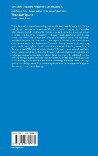 This volume offers a new theoretical approach to the analysis of the law/revenge binary, and attempts to dismantle the common idea of revenge as lacking any legal, moral or rational dimension. In contrast, the book puts forward a model of a complex system of justice-which it terms 'vindicatory'-wherein vendetta constitutes an authorized action, the core of which does not (just) lie in vengeance but also in settlement procedures for peace-or 'composition.' The first part of the book ("Vindicatory Justice: Conceptual Analyses and Forerunners") seeks to identify the nature of vindicatory justice and to shed light on the structure of so-called vindicatory systems. In turn, the second part ("Mapping Vindicatory Justice") illustrates, using examples gathered from a range of sociolegal contexts, the dynamic relationship between composition and authorized revenge in vindicatory systems. Taken as a whole, the volume shows that applying a longue durée historical perspective to the study of revenge systems allows us to clearly recognize composition and authorized revenge as features of the same legal system, even though one of them may seem predominant (or more eye-catching) than the other in certain cultural settings.