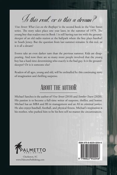 Vine Street: What Lies on the Rooftops? is the second book in the Vine Street series. The story takes place one year later, in the summer of 1979. The young boy that readers met in Book 1 is still having run-ins with the groundskeeper of an old radio station at the ballpark where the boy plays baseball in South Jersey. But the question from last summer remains: Is this real, or is it all a dream? Events take an even darker turn than the previous summer. Kids are disappearing. And now there are so many more people involved that the young boy has a hard time determining who exactly is the bad guy. Is it the groundskeeper? Or is it someone else? Readers of all ages, young and old, will be enthralled by this continuing story of imagination and thrilling suspense.