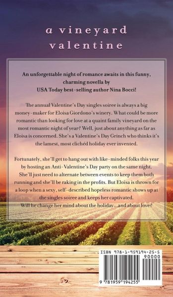 An unforgettable night of romance awaits in this funny, charming novella by USA Today best-selling author Nina Bocci! The annual Valentine's Day singles soirée is always a big money-maker for Eloisa Giordono's winery. What could be more romantic than looking for love at a quaint family vineyard on the most romantic night of year? Well, just about anything as far as Eloisa is concerned. She's a Valentine's Day Grinch who thinks it's the lamest, most cliché holiday ever invented. Fortunately, she'll get to hang out with like-minded folks this year by hosting an Anti-Valentine's Day party on the same night. She'll just need to alternate between events to keep them both running, and she'll be raking in the profits. But Eloisa is thrown for a loop when a sexy, self-described hopeless romantic shows up at the singles soirée and keeps her captivated. Will he change her mind about the holiday... and about love?