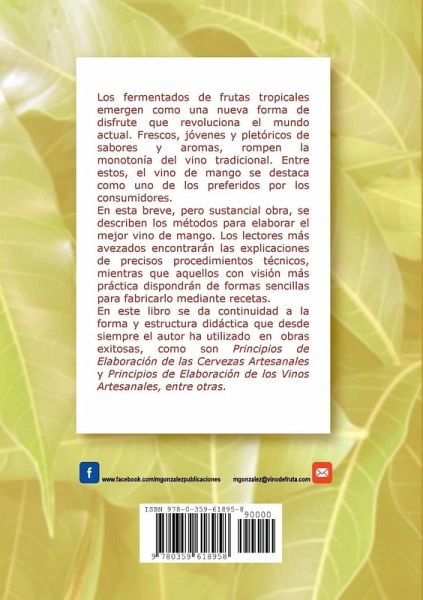Esta breve pero valiosa obra ha sido concebida con el objetivo de orientar a los entusiastas de los vinos alternativos en las metodologías más adecuadas para la elaboración de vino de mango (Mangifera indica). Es un libro que logra llevar al fabricante un paso más allá de los tradicionales vinos de grosellas y de arándanos. Explica de manera clara y precisa cómo preparar este vino utilizando las técnicas propias de la enología, pero también empleando recetas y formulas, muy convenientes para aquellos que desean resultados expeditos.