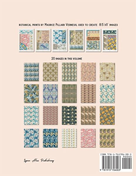 This beautiful "Vintage Botanical Papers" book is a collection of 20 vintage images that you can use as end paper, in scrapbooking, origami, cut-outs, junk journals and much more. There are 19 original images and a vertical representation of one of the horizontal ornaments. Images are not seamless patterns, but they are seamless within the 8.5"x11" size. Repeat patterns are created to fit the US letter format. Some images are re-created using the original elements and all images are digitally enhanced in a way that preserves their original Art Nouveau character. Features include:US letter size-8.5"x11" which is big enough to use in multiple projects There are 19+1 different images- 19 original images and a vertical representation of one of the horizontal ornaments Each image is printed on the front and the back of the page to make them all useable Most "imperfections" are preserved to ensure the image integrity Original colors are preserved and slightly enhanced Includes repeat patterns within 8.5"x11" size as well as horizontal and/or vertical ornamental images Each page can be used as an end paper for A5 size (5.5"x8.5") or smaller Excellent for multiple types of craft projects Printed on a quality paper (70lb or 103gsm) Buy it today for your cherished projects or as a beautiful gift for a crafts lover. Also check the other volumes.