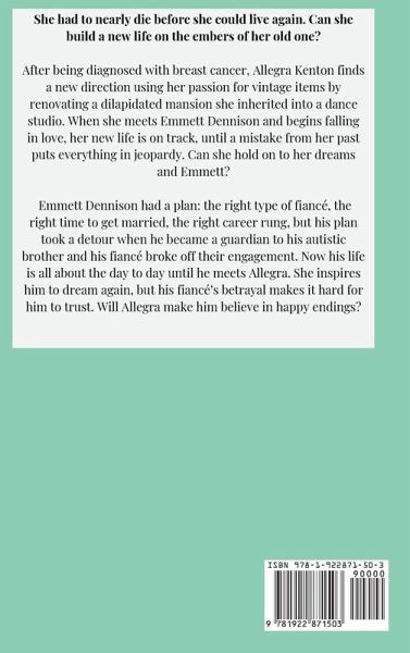 She had to nearly die before she could live again. Can she build a new life on the embers of her old one? After being diagnosed with breast cancer, Allegra Kenton finds a new direction using her passion for vintage items by renovating a dilapidated mansion she inherited into a dance studio. When she meets Emmett Dennison and begins falling in love, her new life is on track, until a mistake from her past puts everything in jeopardy. Can she hold on to her dreams and Emmett? Emmett Dennison had a plan: the right type of fiancé, the right time to get married, the right career rung, but his plan took a detour when he became a guardian to his autistic brother and his fiancé broke off their engagement. Now his life is all about the day to day until he meets Allegra. She inspires him to dream again, but his fiancé's betrayal makes it hard for him to trust. Will Allegra make him believe in happy endings?