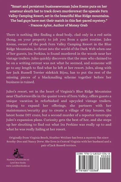 There is nothing like finding a dead body, clad only in a red satin thong, on your property to jolt you from a quiet routine. Jules Keene, owner of the posh Fern Valley Camping Resort in the Blue Ridge Mountains, is thrust into the world of the Dark Web when one of her guests, Ira Perkins, is found murdered in the woods near her vintage trailers. Jules quickly discovers that the man who claimed to be on a writing retreat was not what he seemed, and someone will go to any length to find what he left at her resort. Jules, along with her Jack Russell Terrier sidekick Bijou, has to put the rest of the missing pieces of a blackmailing scheme together before her business is ruined. Jules's resort, set in the heart of Virginia's Blue Ridge Mountains near Charlottesville in the quaint town of Fern Valley, offers guests a unique vacation in refurbished and upcycled vintage trailers. Hoping to expand her offerings, she partners with her maintenance/security guy to create a village of tiny houses, the latest home DIY craze, but a second murder of a reporter interrupts Jules's expansion plans. Curiosity gets the best of her, and she steps up her sleuthing to find out what Ira Perkins was really up to and what he was really hiding at her resort.