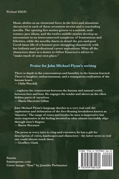 Music abides as an elemental force in the lives and situations chronicled in each of these seventeen stories and a concluding novella. The opening five stories groove to a noirish, mid-century jazz idiom, and the twelve middle stories develop as movements in an interconnected symphony of frustrations and felicities, while the novella charts in detail the pre-and-post Covid inner life of a boomer poet struggling obsessively with her bulimia and professional career aspirations. What all the characters share is a desire to follow Emerson's advice to "make much of your own place."