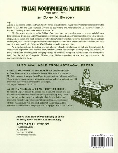 Here is the second volume in Dana Batory?s series of guides to the major woodworking machinery manufacturers of the 19th and 20th centuries. Covered in this volume are Parks Machine Co., the Boice-Crane Co., Baxter D. Whitney & Son, and Crescent Machine Co. All these manufacturers built a full line of woodworking machines, but most became especially known for a particular group, e.g., Boice-Crane produced medium size and capacity machines that were ideal for home shops, school shops and small business woodworkers; Whitney was famous for its thickness planers and spindle shapers, as well as for a large collection of cooperage machines; and Crescent won renown for its bandsaws and table saws, and for its Universal Wood-Worker, a combination machine. As in his first volume, the author provides a history of each manufacturer, as well as a description of the evolution of its product lines over the years. Accompanying the histories are many illustrations taken from the catalogs of the period. This is a mine of information about old woodworking machines and the companies that made them.