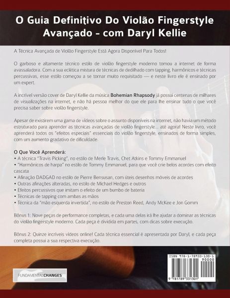O Guia Definitivo Do Violão Fingerstyle Avançado - com Daryl Kellie A Técnica Avançada de Violão Fingerstyle Está Agora Disponível Para Todos! O garboso e altamente técnico estilo de violão fingerstyle moderno tomou a internet de forma avassaladora. Com a sua eclética mistura de técnicas de dedilhado com tapping, harmônicos e técnicas percussivas, esse estilo começou a se tornar muito requisitado - e neste livro ele é ensinado por um expert. A incrível versão cover de Daryl Kellie da música Bohemian Rhapsody já possui centenas de milhares de visualizações na internet, e não há pessoa melhor do que ele para lhe ensinar tudo o que você precisa saber sobre violão fingerstyle. Apesar de existirem uma gama de vídeos sobre o assunto disponíveis na internet, não havia um método estruturado para aprender as técnicas avançadas de violão fingerstyle... até agora! Neste livro, você aprenderá todos os "efeitos especiais" essenciais do violão fingerstyle, ensinados de forma simples, com um aumento gradativo de dificuldade. O Que Você Aprenderá: ¿ A técnica "Travis Picking", no estilo de Merle Travis, Chet Atkins e Tommy Emmanuel ¿ "Harmônicos de harpa" no estilo de Tommy Emmanuel, para que você crie belos acordes com efeito cascata ¿ Afinação DADGAD no estilo de Pierre Bensusan, com úteis desenhos móveis de acordes ¿ Outras afinações alteradas, no estilo de Michael Hedges e outros ¿ Efeitos percussivos que imitam o efeito de um bumbo de bateria ¿ Técnicas de tapping com ambas as mãos ¿ Técnica da "mão esquerda invertida", no estilo de Preston Reed, Andy McKee e Jon Gomm Bônus 1: Nove peças de performance completas, e cada uma delas irá lhe ajudar a dominar as técnicas do violão fingerstyle moderno. Cada peça é dividida em partes, com dicas sobre execução. Bônus 2: Quinze incríveis vídeos online! Cada técnica essencial é apresentada por Daryl, e cada peça completa possui a sua respectiva execução.